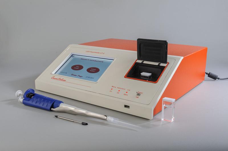 Quantalase has developed Fluorimeters which use banks of pulsed LEDs to excite fluorescence in sample under study. The wavelength, pulse duration and peak power of the LED output can be set to match the excitation requirements of the sample. The fluorescence is detected by a pulsed photomultiplier. Suitable filters after the LEDs and before the photomultiplier tube prevent LED light from reaching the photomultiplier tube directly. The filters can be broad band coloured glass filters or multilayer narrow band filters. The instrument is controlled by a microcontroller which pulses the LEDs and photomultiplier tube. The microcontroller also controls the ADC which convert the fluorescence signal from photomultiplier to digital form for further processing. A single board computer averages the photomultiplier output over 2000 pulses and carries out any calculations necessary.A touch screen display permits the operator to set necessary parameters and also display the fluorescence measurement.